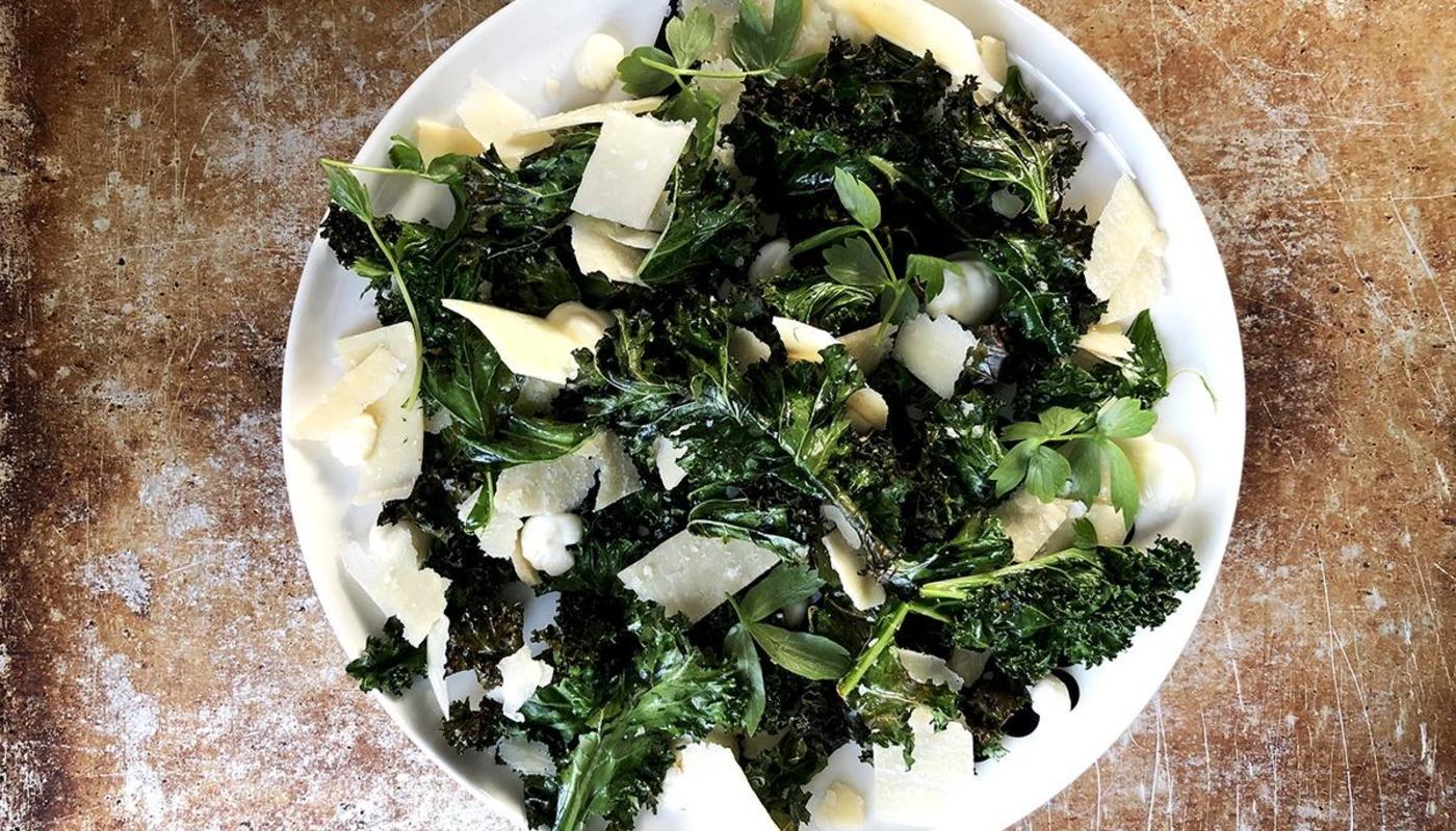 - Sätt grönkål, olivolja och flingsalt i en skål, blanda allt med händerna.