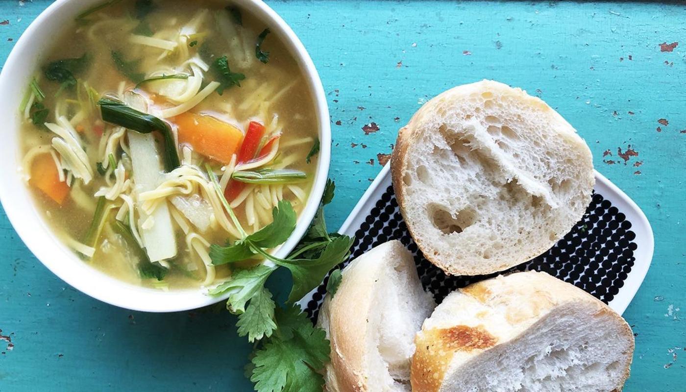 - Sätt moroten, palsternackan, vitlöken och löken i den kokande buljongen, låt sjuda ca 5 min, tillsätt kikärtsnudlarna samt de övriga grönsakerna förutom koriandern och chilin, låt koka ytterligare 3-4 minuter.