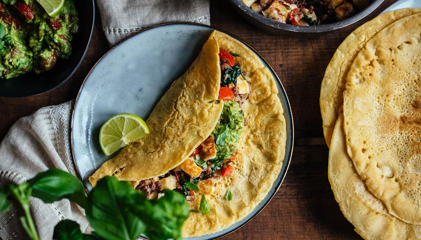 Tortillas gjorda med kikärtsmjöl är ett perfekt alternativ till vanliga tortillas. Fyll med vad du vill, i detta recept är de fyllda med rött ris, paprika, babyspenat och halloumiost samt en avokadoröra.