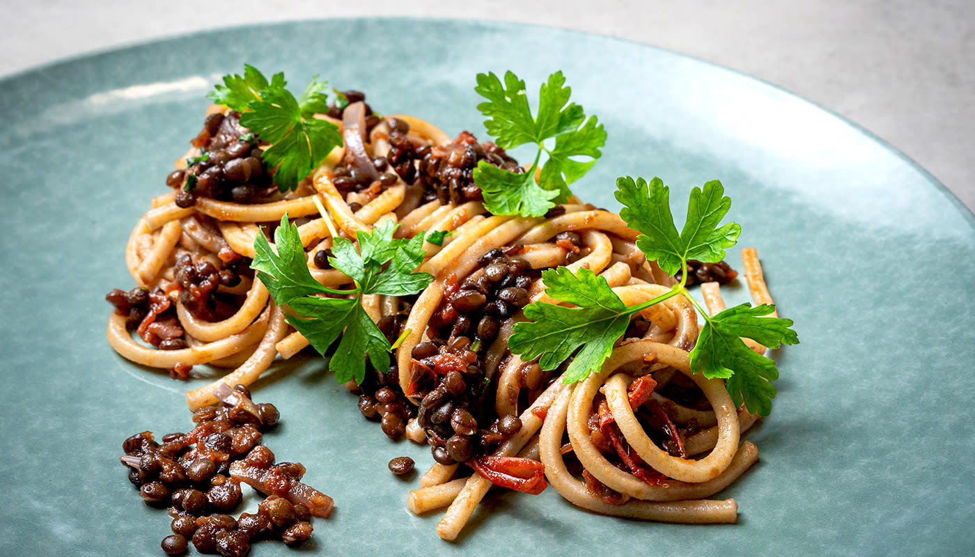 Pasta - vardagens räddning, men bör ej glömmas att den likväl passar till fest. I detta recept smaksätts spagettin med härliga favorino tomater och proteinrika och smakrika belugalinser.