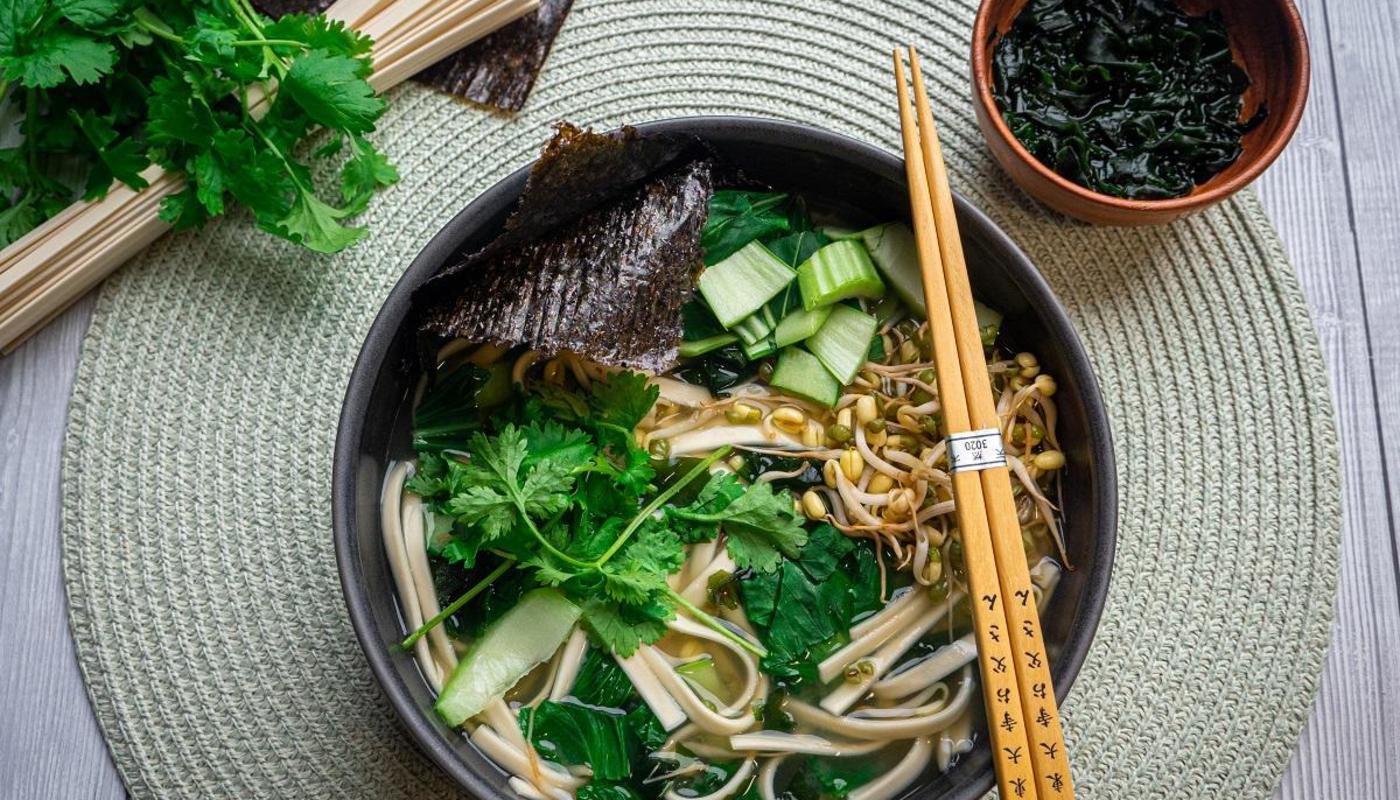 - Tillsätt i skålarna, paksoi, röd chili, groddar och nori skivor.