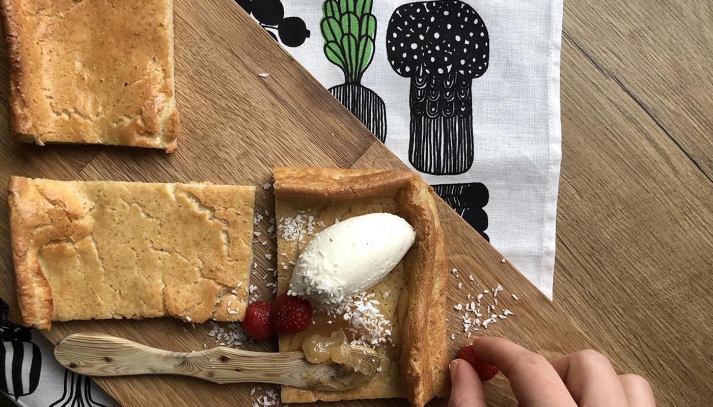 En pannkaka i långpanna har räddat många barnfamiljers matbekymmer! Denna pannkaka får karaktär av kokos och är dessutom helt mjölkfri då den görs på mandelmjölk!