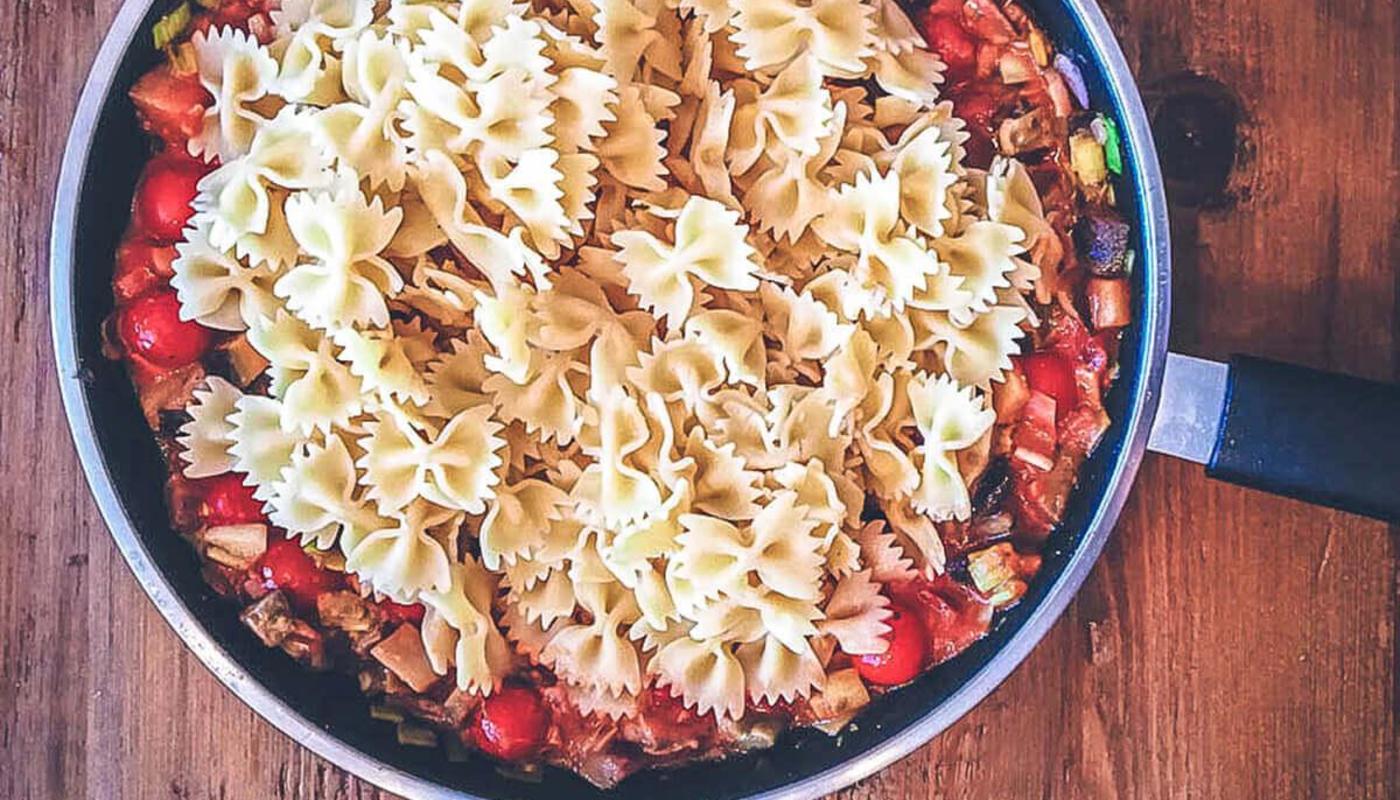 - Keitä pasta lähes kypsäksi, silppua kasvikset.