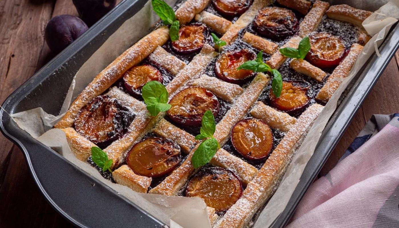 - Skär av en smördegsplatta dekorationer att lägga mellan plommonen.