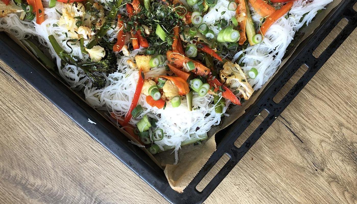 - Varva grönsakerna med ett lager kokta nudlar, sätt resten av grönksakerna ovanpå, strö över ringar av vårlök och finhackad timjan.