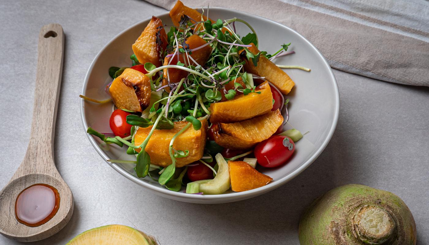 Kålrot kan bra användas i annat än lådor och soppor. Rostad kålrottssallad, ett utmärkt recept där kålroten står för den varma och matiga delen i en sallad. Prova, överraskande!