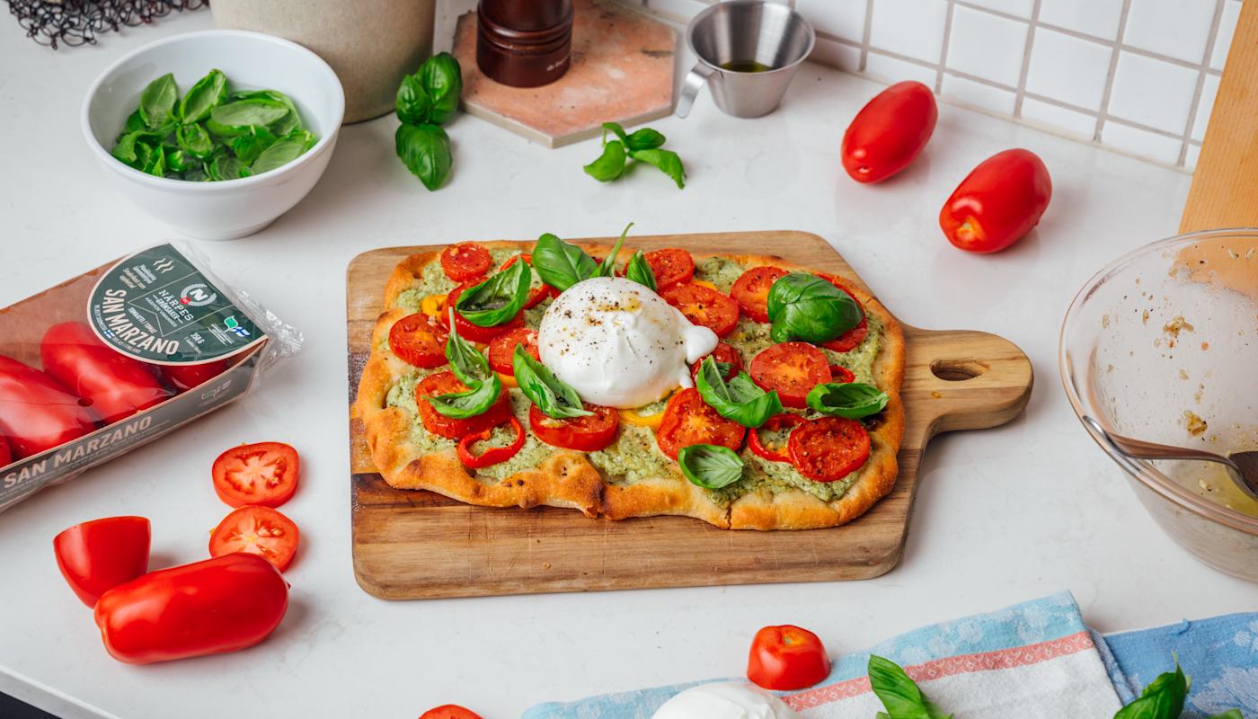 Trendig pinsa med saftiga tomater – ja tack! Pinsa gjord på Närpes Grönsakers San Marzano-tomater charmar med sin krispiga botten och fylliga sås.