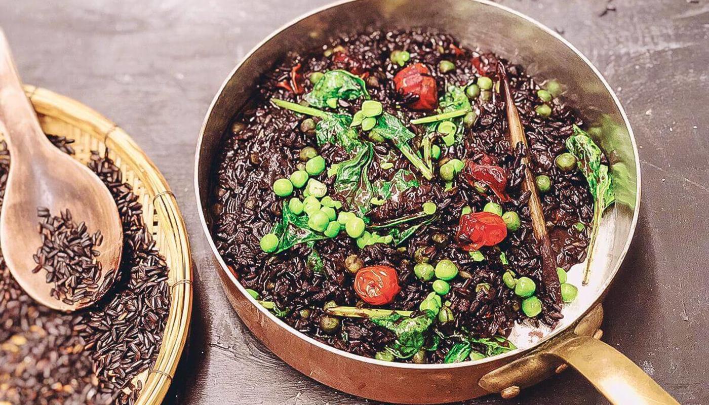 Jag älskar svart ris av god kvalitet – riset i receptet är en sort från norra Italien – och fullmatat med smak, nämligen umami. Innehåller dessutom rikligt med antioxidanter.