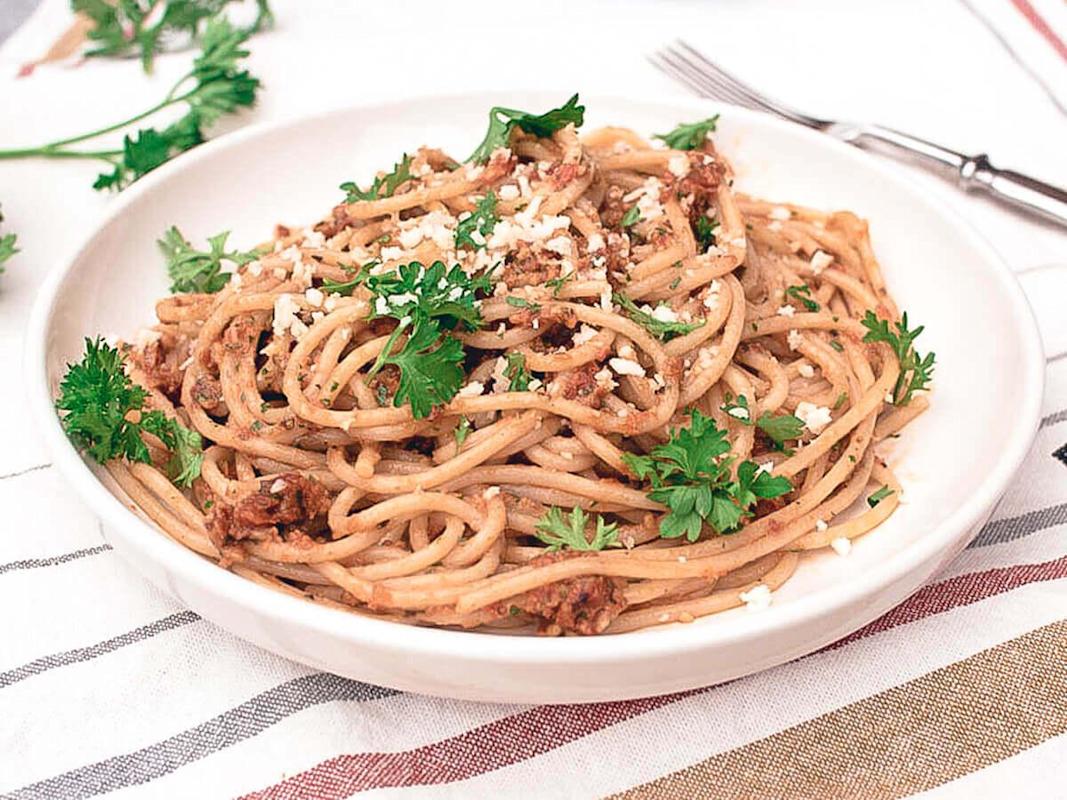 Häll av spagettin och blanda peston med spagettin. Dekorera med persilja och riv parmesanost ovanpå.