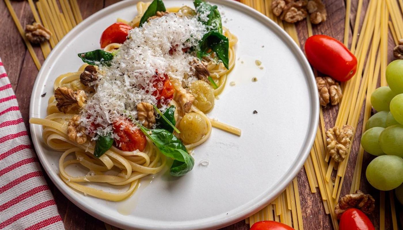 - Tillsätt spenaten, de rostade tomaterna och vindruvorna, valnötterna och gräslöken i pastan.