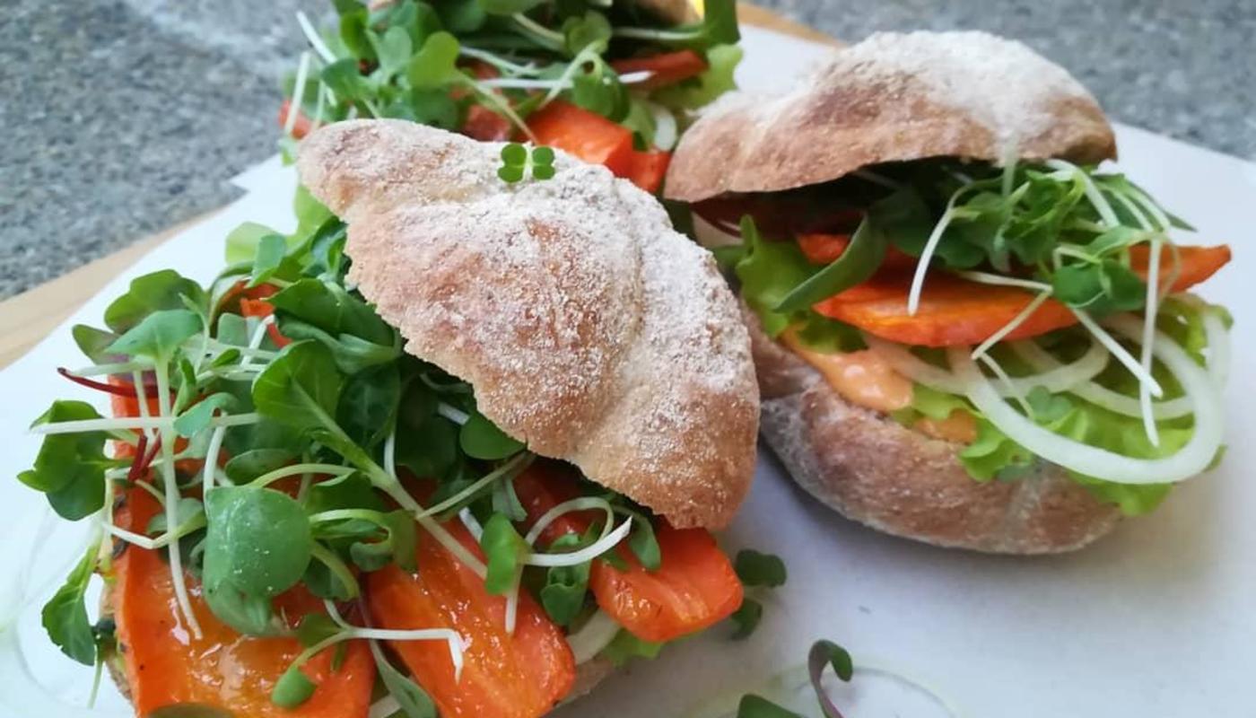 Som fyllning i de vegetariska hamburgarna har vi rostad morot, sallad, rucola skott, röda mangold skott, lökringar och paprikamajonnäs.