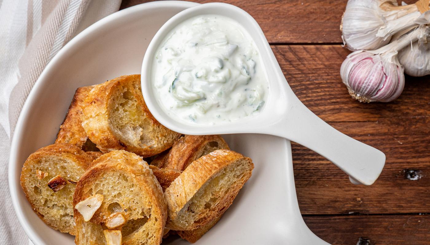 - Blanda i en skål yoghurt, riven gurka, salt, svartpeppar och en fint riven vitlöksklyfta.