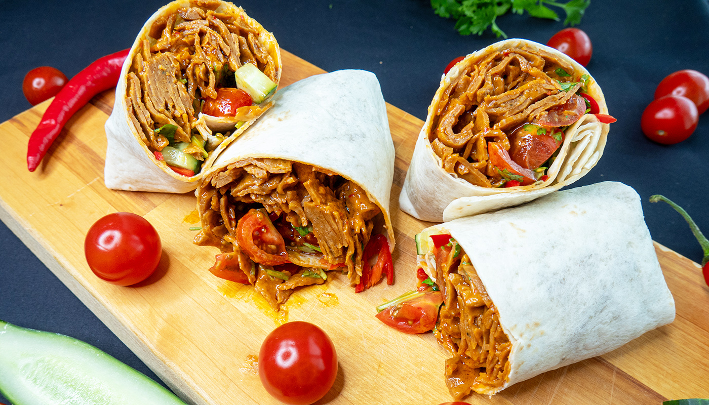 Lägg till skivad chili och finhackad koriander, rulla ihop tortillan och skär på mitten.