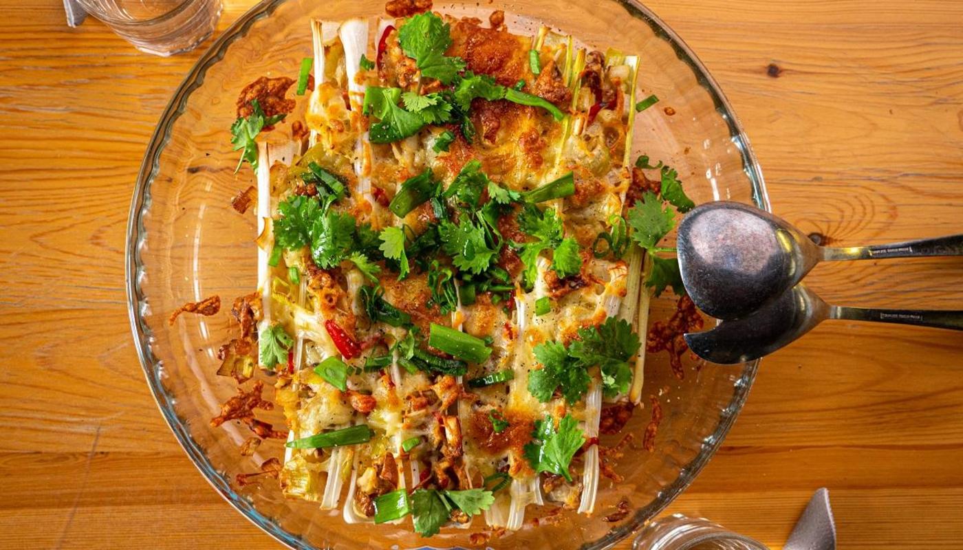 - Täytyä halkaisut purjon puolikkaat ja kypsennä uunissa 180 astetta noin 25 minuuttia.