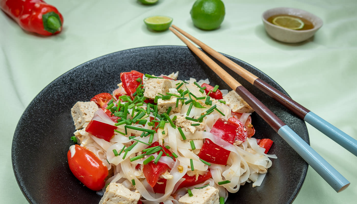 - Lisää marinoidut kasvikset keitettyjen nuudelien kanssa kulhoon ja sekoita hyvin.
