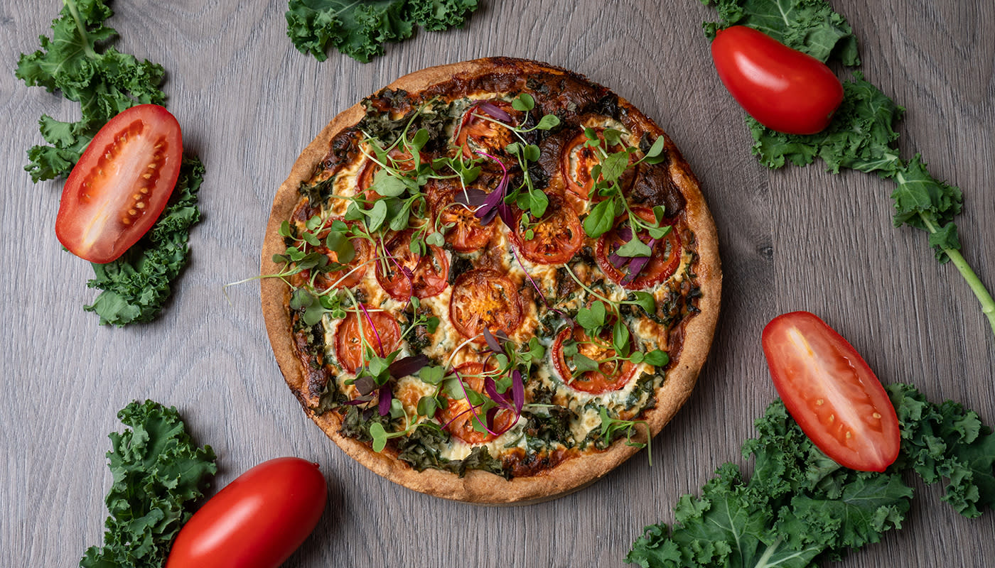 - Asettele piirakkapohjan päälle tomaattisiivuja ja revittyä lehtikaalia.