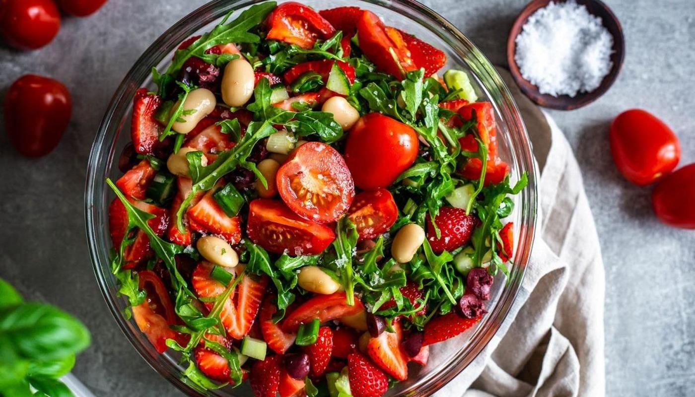 Raikas tomaatti- ja mansikkasalaatti saa täyteläisyyttä valkoisista pavuista – täydellinen kasvisruoka kesän juhliin, lounaaksi tai kevyeksi illalliseksi. Tämä helppo ja nopea salaattiresepti yhdistää makeat mansikat, mehukkaat tomaatit ja proteiinipitoiset pavut herkulliseksi kokonaisuudeksi. Gluteeniton ja vegaaninen salaatti sopii monen ruokavalioon ja hurmaa sekä arjessa että kattauksessa!