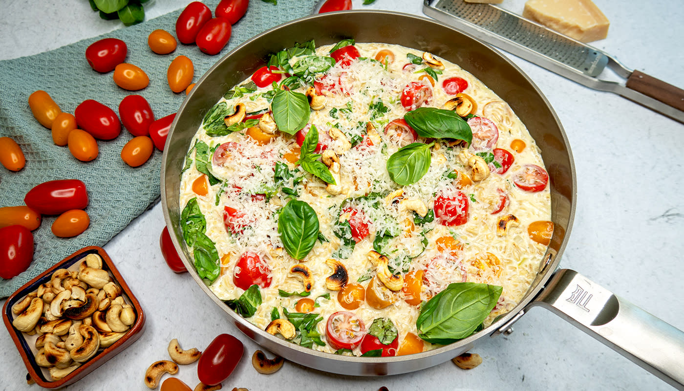 - Viimeistele annos paahdetuilla cashew-pähkinöillä, parmesaanijuustoraasteella ja basilikalla.