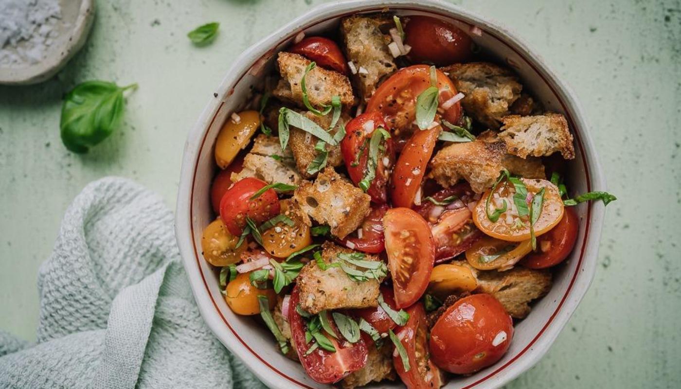 Raikkaat tomaattisalaatit maistuvat kesältä! Tomaattipanzanella on ihana mökkisalaatti, johon uppoaa myös se ei-enää-ihan-niin-tuore leipä.