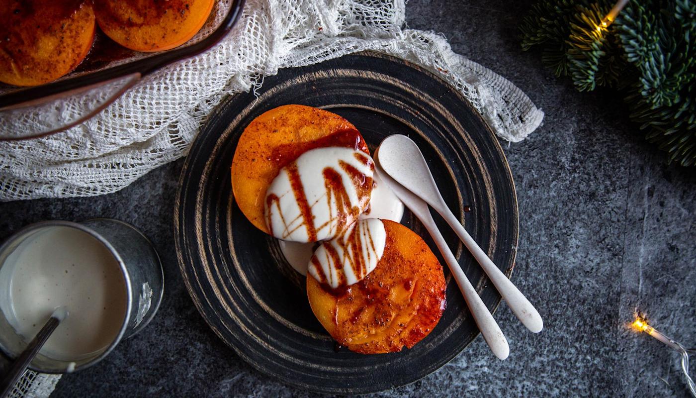 - Ota persimonhedelmät uunista ja raaputa lusikan avulla hunajasekoitus uunivuoasta ja kaada persimonhedelmen päälle.
