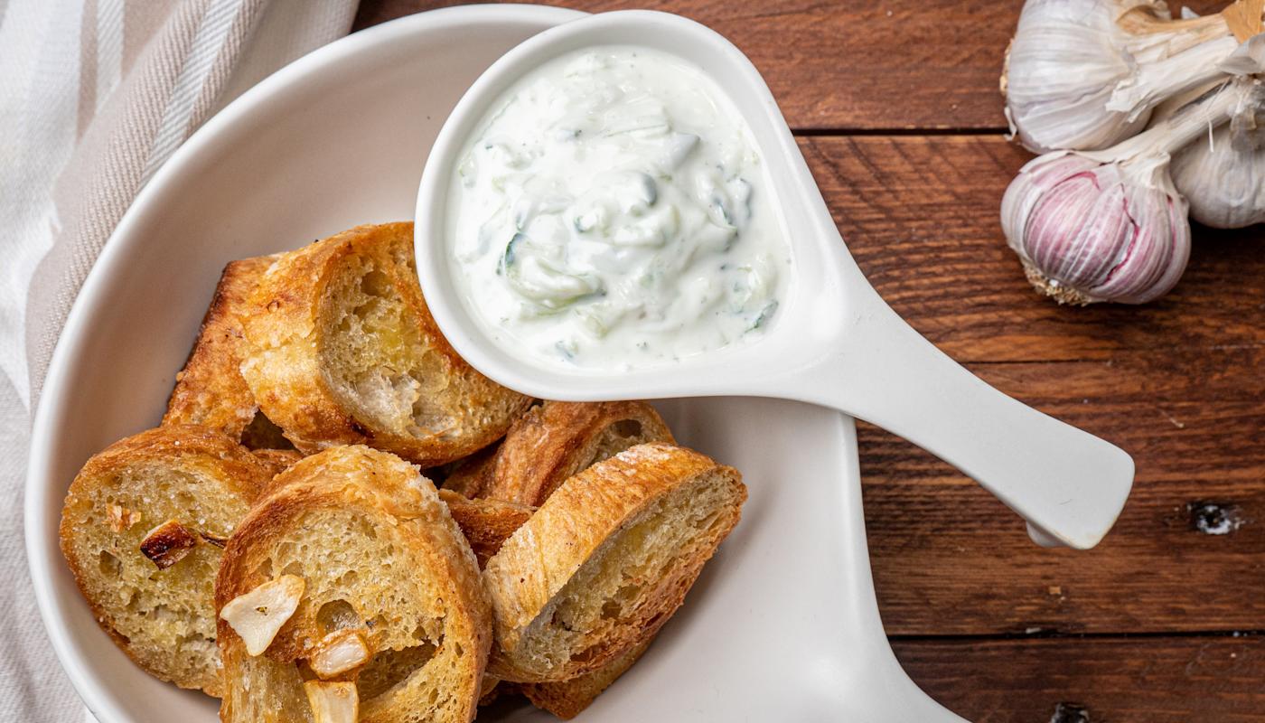 - Sekoita kulhossa jugurtti, raastettu kurkku, suola, mustapippuri ja yksi valkosipulinkynsi raastettuna hienoksi.