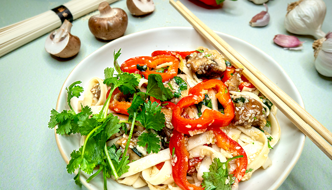 Valkosipulinuudelit suippopaprikalla ja sienillä