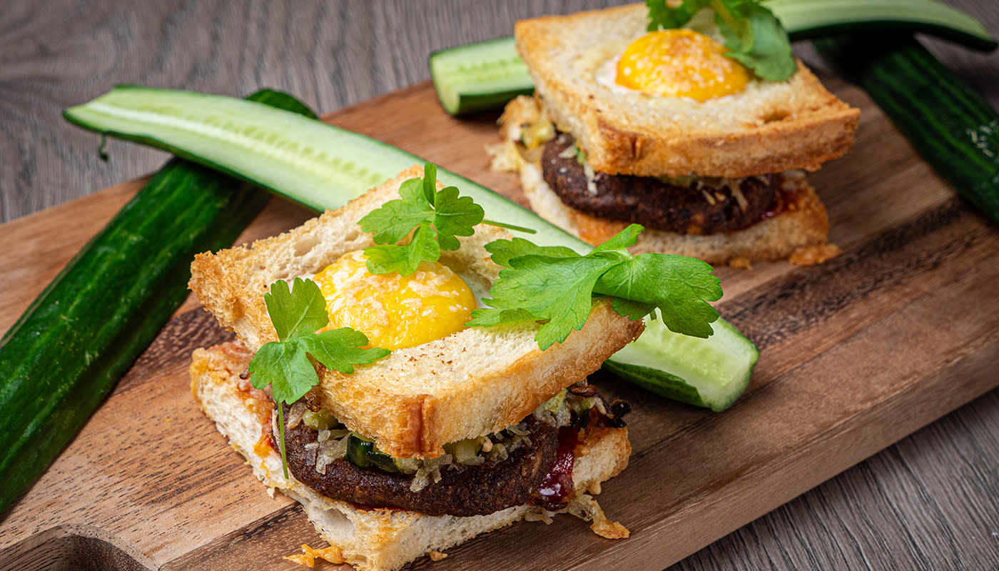 - Riko leipien keskelle kananmuna.
