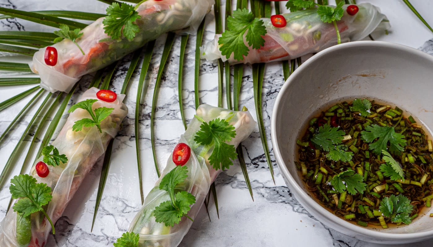 - Asettele riisipaperille kevätsipulia, punasipulia, paprikaa, sokerihernettä ja ituja.